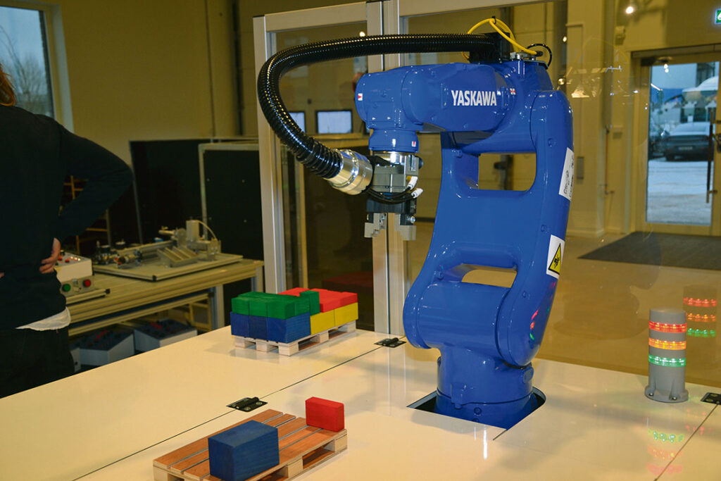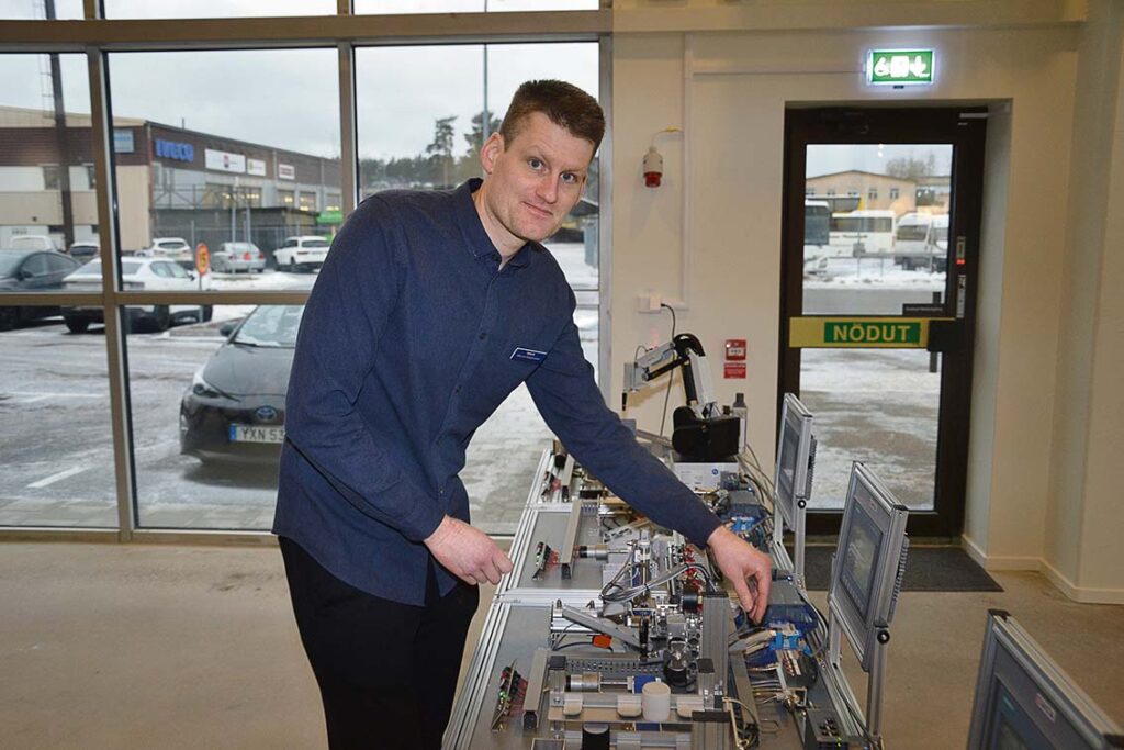 – Det finns en stor vinst för företag att låta ny personal komma hit och läsa automation grund där de får en helhet och sedan ha möjlighet att bygga på den kunskapen med robot grund och pneumatik och mekatronik grund, säger Marcus Kaspersson och demonstrerar ett flöde i en processline.