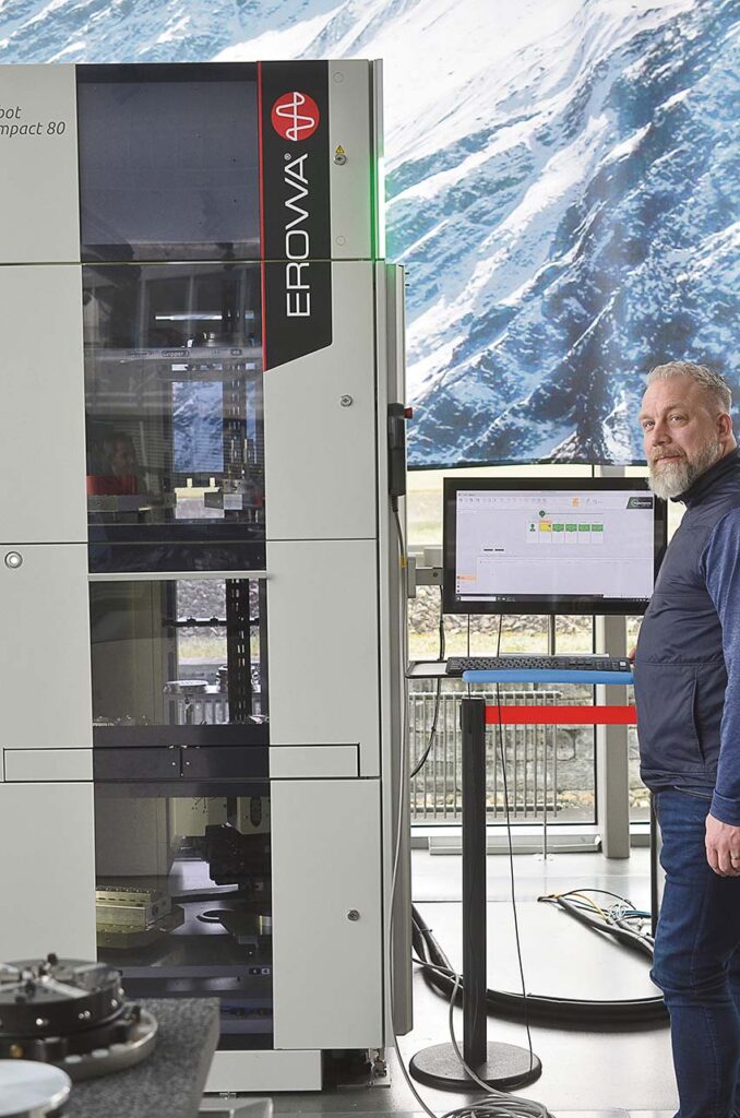 – Vår produkt EROWA Compact 80 är det som är aktuell i detta sammanhang. Lyftkapacitet 80 kg. Möjlighet att blanda palettstorlekar, 25 st ITS 148 Paletter, 9 st PC210 Paletter. EWIS RFID System. Celldatorstyrning: JMS4.0 Production Line, för att styra och övervaka maskinen, informerar Ola Melin.